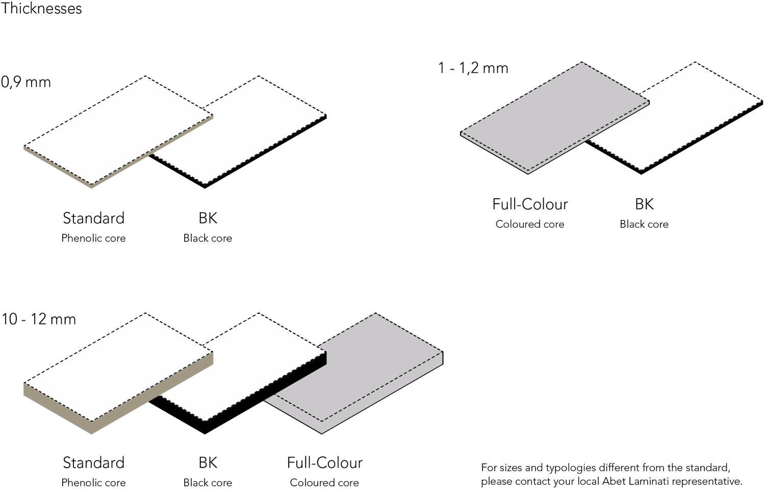 Pod jednotlivými obrázky naleznete orientační (nejpodobnější) přiřazení k barevnným standardúm (RAL, NCS nebo Pantone). Jádro: hnědé, černé, bílé, (probarvené). Odkaz na obrázky probarvených jader "Full color" neleznete zde: http://www.laminatyprotruhlare.cz/abet-laminati/typy-jadra-u-kompaktnich-desek-compact.aspx